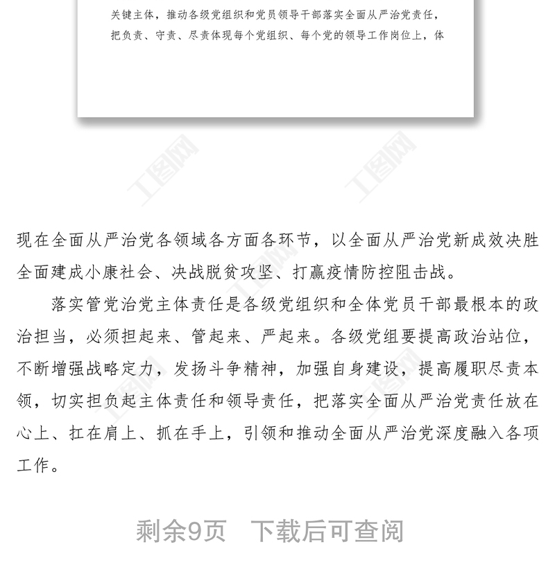 工圖網(wǎng)提供2021《黨委(黨組)落實全面從嚴治黨主體責(zé)任規(guī)定》學(xué)習(xí)心得研討發(fā)言材料5篇供會員免費下載。更多精彩黨課PPT素材,盡在工圖網(wǎng)。
