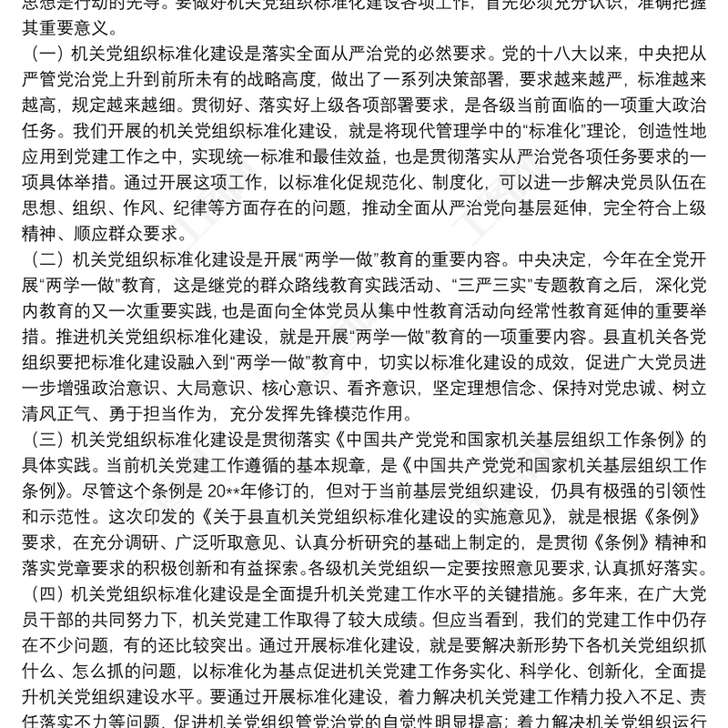 領導在20xx年全縣機關黨組織標準化建設工作會議上的講話范文