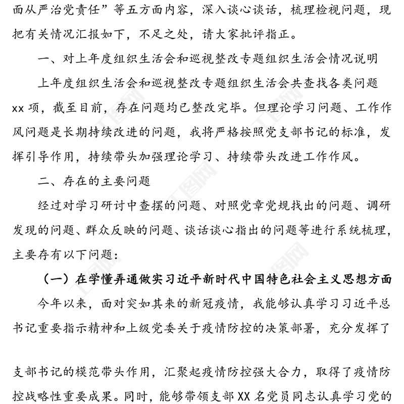 工圖網(wǎng)提供黨支部書(shū)記2020年民主生活會(huì)五個(gè)方面對(duì)照檢查發(fā)言材料范文(1)供會(huì)員免費(fèi)下載。更多精彩黨課PPT素材,盡在工圖網(wǎng)。