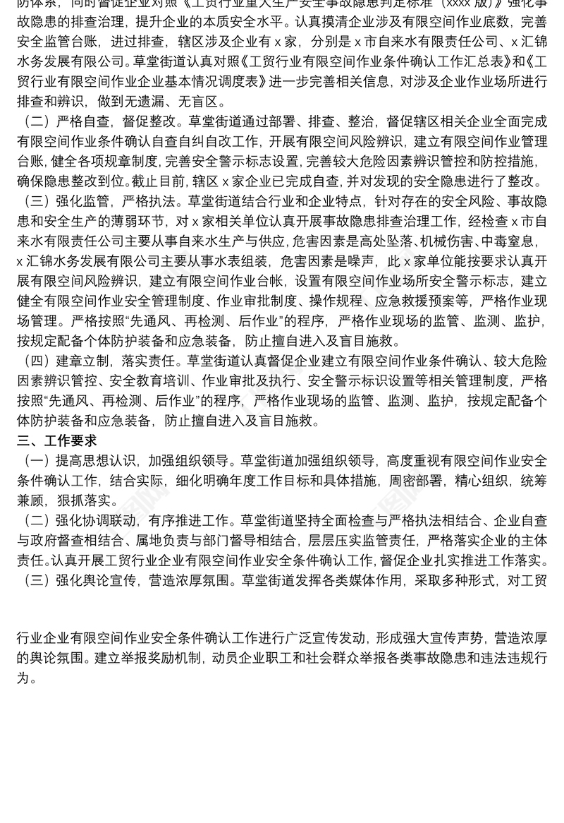 街道開展工貿(mào)行業(yè)企業(yè)有限空間作業(yè)安全條件確認(rèn)工作總結(jié)范文
