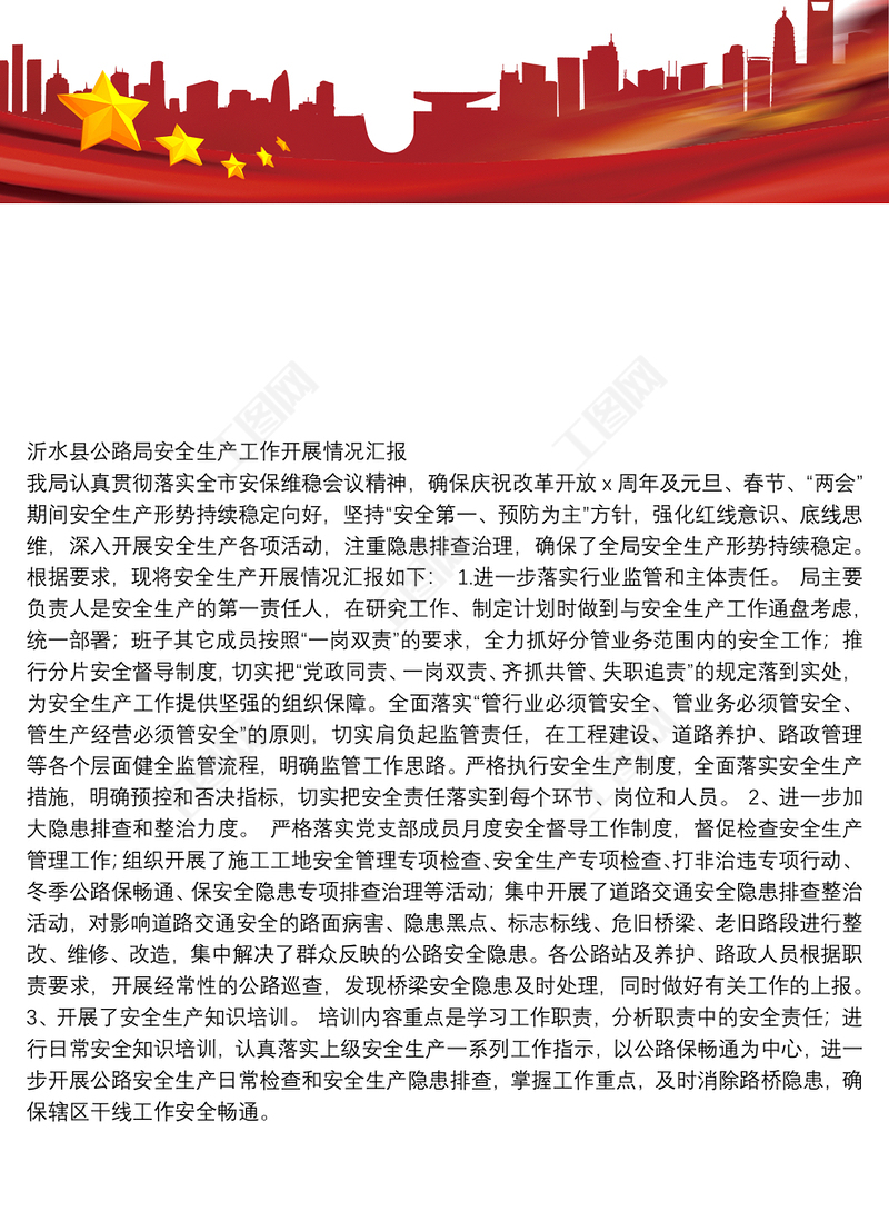 工圖網提供沂水縣公路局安全生產工作開展情況匯報供會員免費下載。更多精彩黨課PPT素材,盡在工圖網。