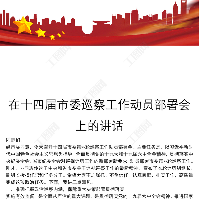 工圖網(wǎng)提供在十四屆市委巡察工作動員部署會上的講話供會員免費下載。更多精彩黨課PPT素材,盡在工圖網(wǎng)。