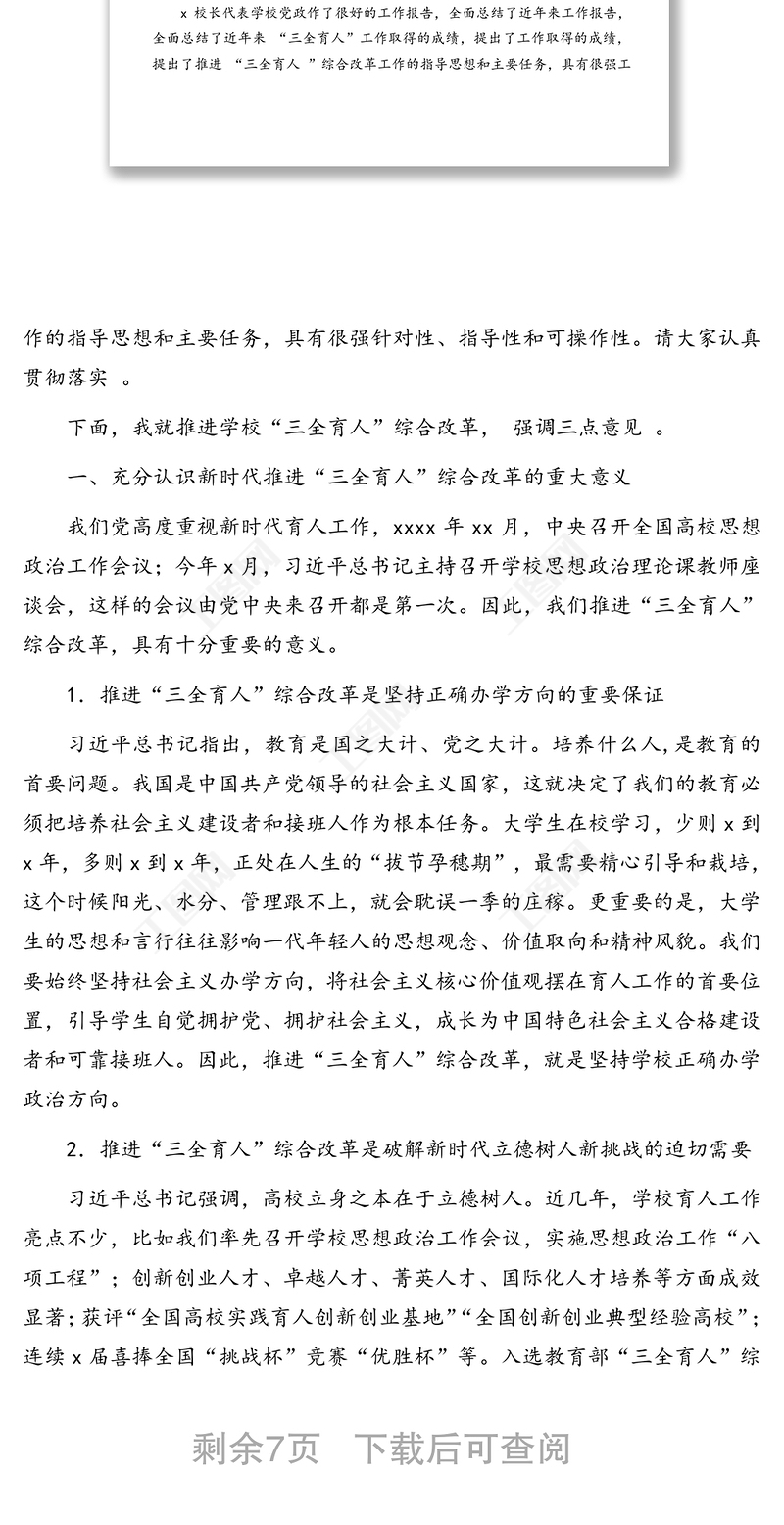 黨委書記在“三全育人”綜合改革工作推進會上的講話(高校),三全育人,公文范例,領導述職報告,機關公文寫作 Array