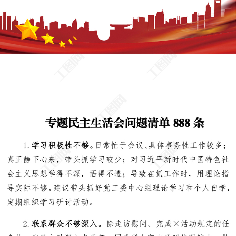 工圖網(wǎng)提供專題民主生活會問題清單888條供會員免費下載。更多精彩黨課PPT素材,盡在工圖網(wǎng)。