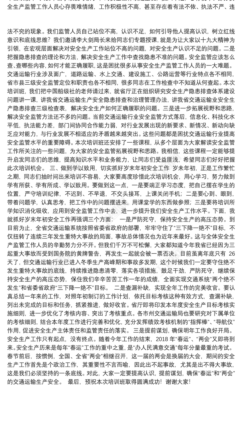 在全省交通運(yùn)輸安全生產(chǎn)監(jiān)管人員培訓(xùn)班開(kāi)班儀式上的講話