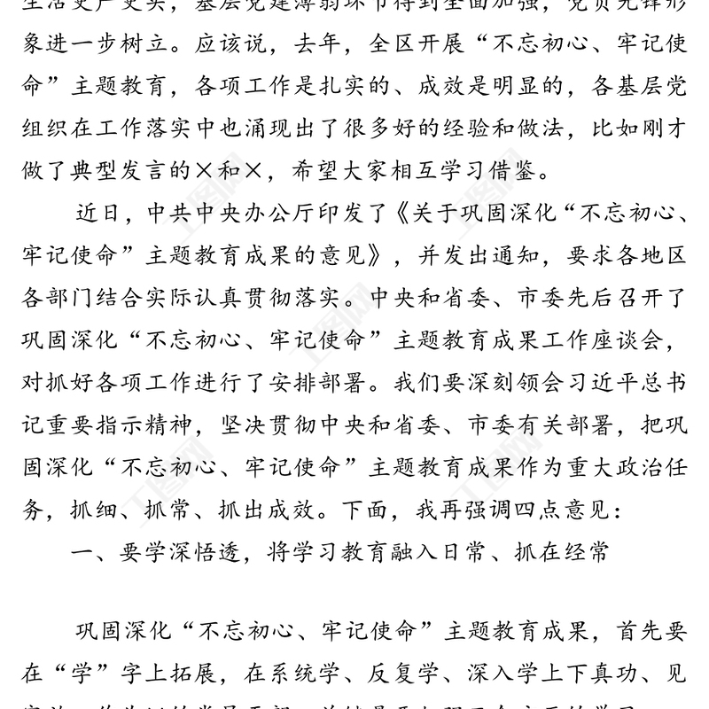 工圖網提供在全區鞏固深化“不忘初心牢記使命”主題教育成果工作座談會上的講話提綱供會員免費下載。更多精彩黨課PPT素材,盡在工圖網。