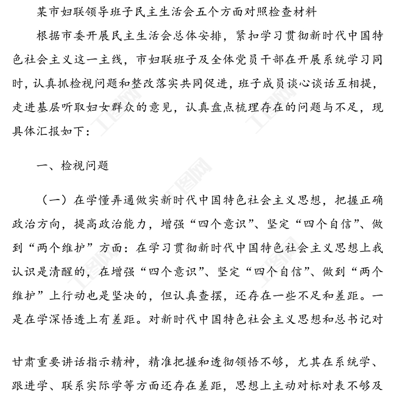工圖網(wǎng)提供領(lǐng)導(dǎo)班子民主生活會(huì)五個(gè)方面對(duì)照檢查材料[4篇材料]供會(huì)員免費(fèi)下載。更多精彩黨課PPT素材,盡在工圖網(wǎng)。