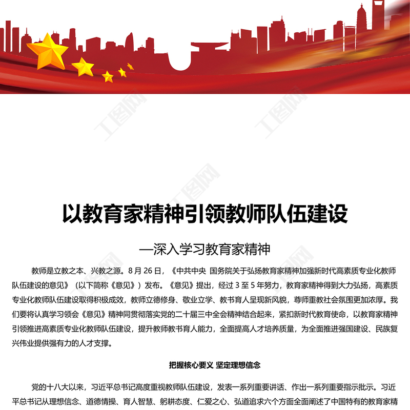工圖網(wǎng)提供以教育家精神引領(lǐng)教師隊(duì)伍建設(shè)PPT深入學(xué)習(xí)教育家精神課件(講稿)供會(huì)員免費(fèi)下載。更多精彩黨課PPT素材,盡在工圖網(wǎng)。