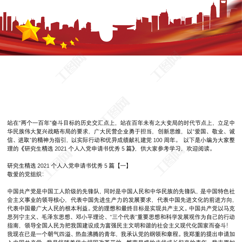 工圖網(wǎng)提供研究生精選2021個人入黨申請書優(yōu)秀5篇供會員免費下載。更多精彩黨課PPT素材,盡在工圖網(wǎng)。