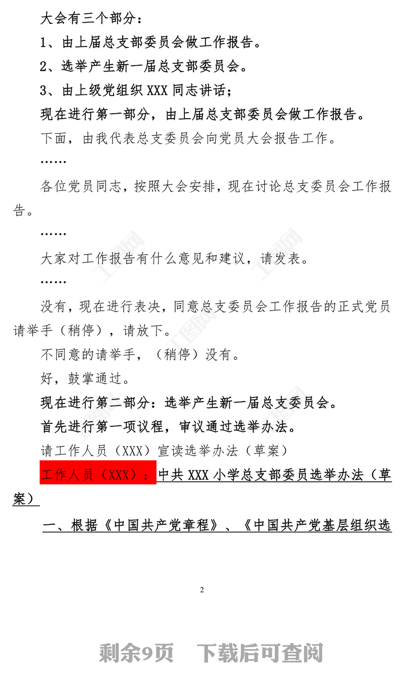 黨支部換屆選舉全套資料(9篇,含選舉程序,選舉辦法,主持詞,工作報告,選票等)包含
