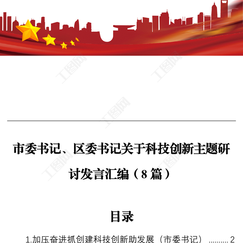 工圖網(wǎng)提供市委書(shū)記、區(qū)委書(shū)記關(guān)于科技創(chuàng)新主題研討發(fā)言匯編(8篇)供會(huì)員免費(fèi)下載。更多精彩黨課PPT素材,盡在工圖網(wǎng)。