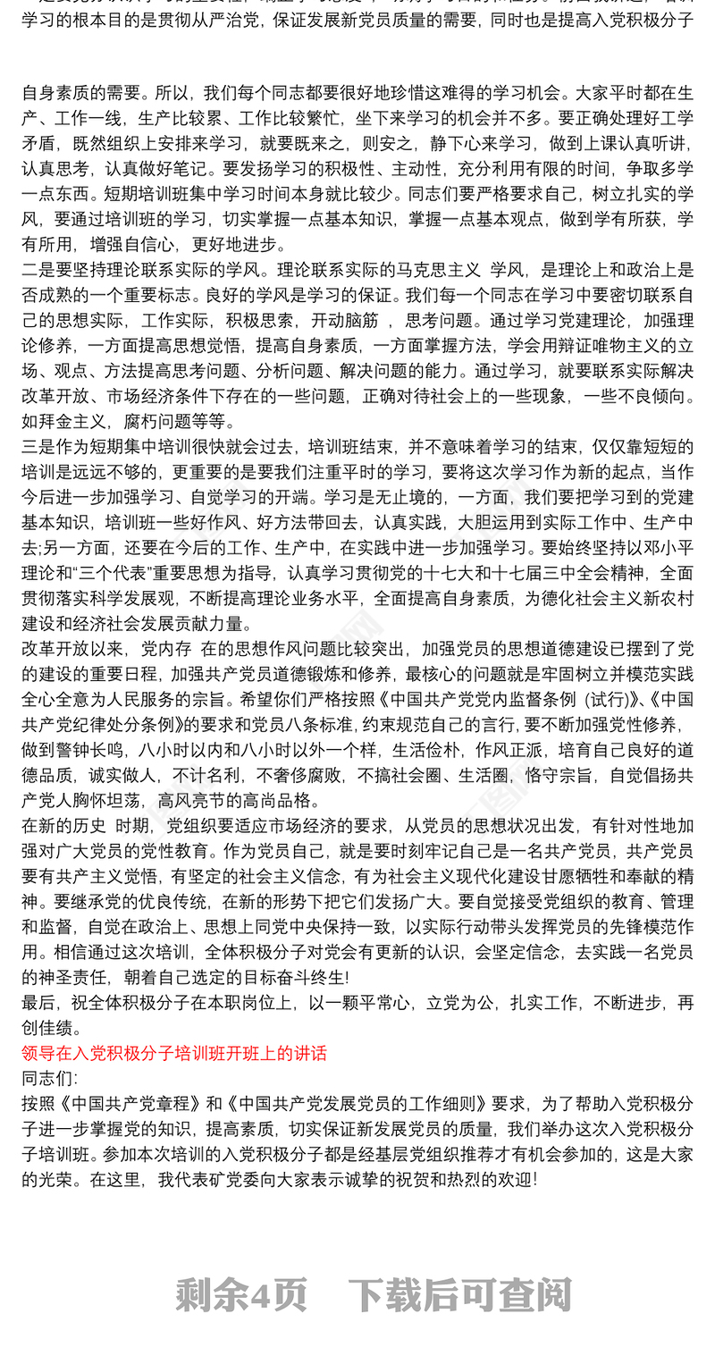 工圖網提供領導在入黨積極分子培訓班開班上的講話供會員免費下載。更多精彩黨課PPT素材,盡在工圖網。