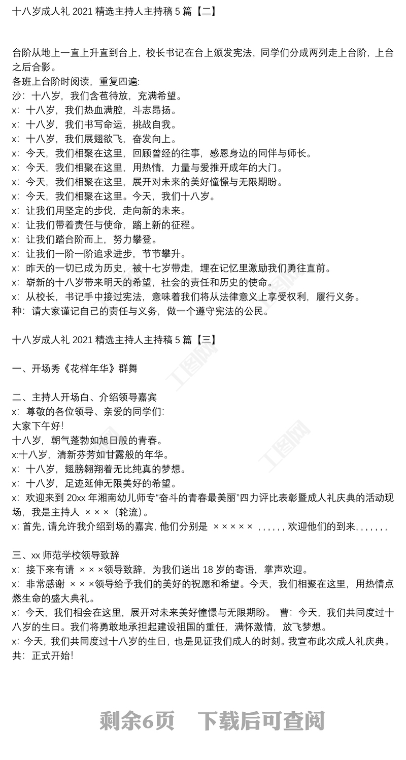 工圖網(wǎng)提供十八歲成人禮2021精選主持人主持稿5篇供會員免費(fèi)下載。更多精彩黨課PPT素材,盡在工圖網(wǎng)。