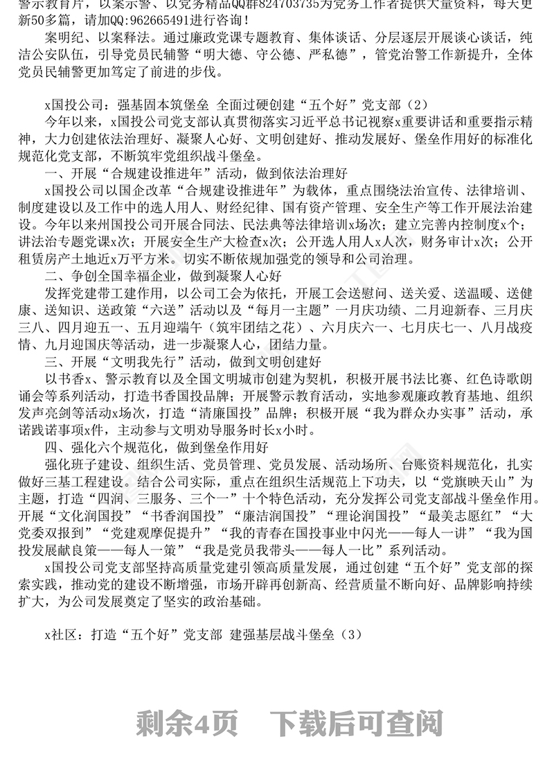 2022五好黨支部創(chuàng)建活動(dòng)實(shí)施方案2022黨支部創(chuàng)建四強(qiáng)工作自評(píng)報(bào)告2022市域社會(huì)治理現(xiàn)代化典型經(jīng)驗(yàn)材料2022有事好商量工作經(jīng)驗(yàn)交流材料在全市平安建設(shè)工作經(jīng)驗(yàn)交流會(huì)上的發(fā)言材料20212022市域社會(huì)治理現(xiàn)代化經(jīng)驗(yàn)典型匯報(bào)材料2021施工項(xiàng)目黨支部黨建工作亮點(diǎn)經(jīng)驗(yàn)材料2022年派出所黨支部黨建工作總結(jié)2022村規(guī)民約典型經(jīng)驗(yàn)材料2022我為群眾辦實(shí)事經(jīng)典案例經(jīng)驗(yàn)材料2022年機(jī)關(guān)黨支部黨建工作述職評(píng)議考核反饋問題整改方案2022年黨支部黨建工作思路2022四強(qiáng)黨支部創(chuàng)建工作方案2023企業(yè)黨支部黨建工作總結(jié)2023黨內(nèi)主題教育經(jīng)驗(yàn)材料