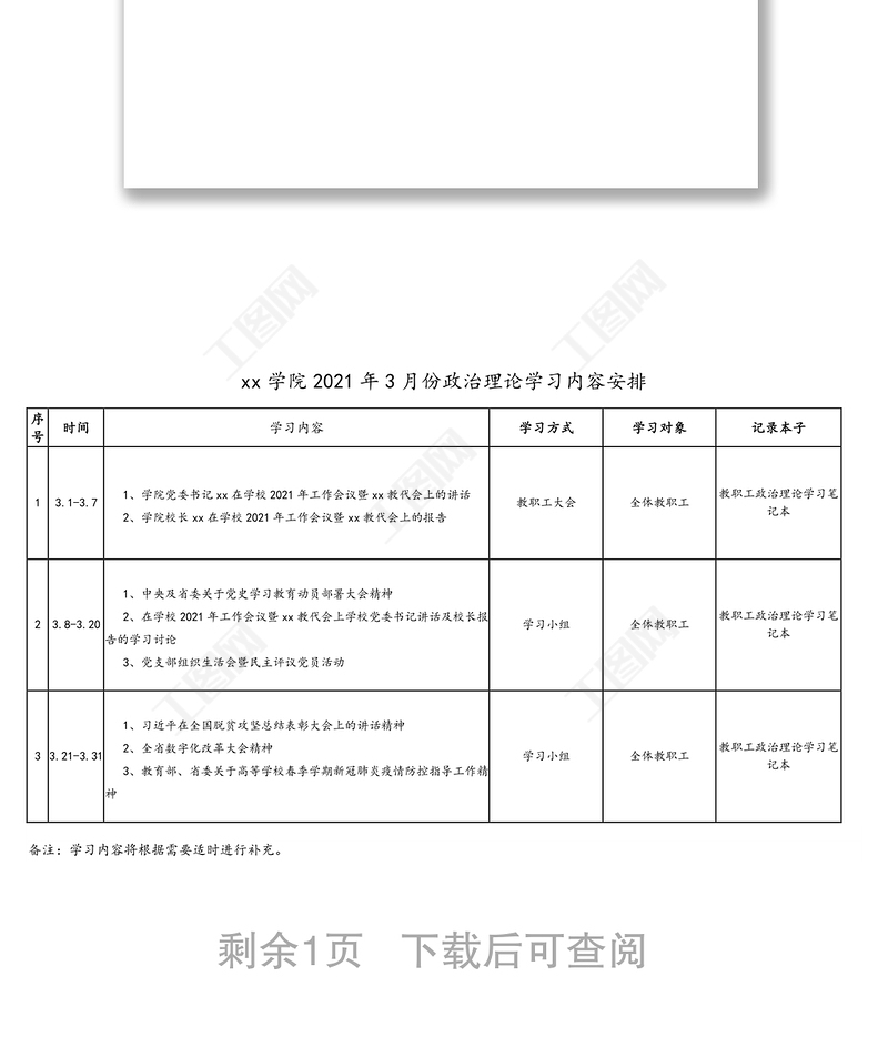 工圖網提供xx市xx中學2021年第一季度政治理論學習安排表供會員免費下載。更多精彩黨課PPT素材,盡在工圖網。