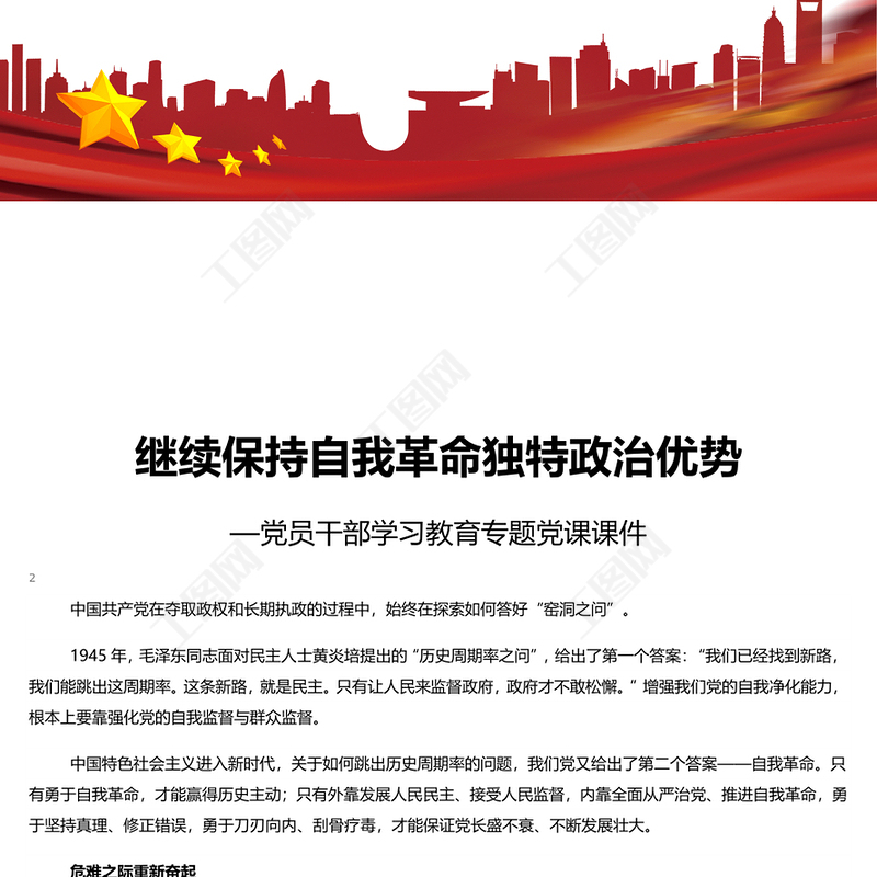工圖網提供繼續保持自我革命獨特政治優勢 黨員干部學習教育專題黨課課件演講稿 發言材料供會員免費下載。更多精彩黨課PPT素材,盡在工圖網。