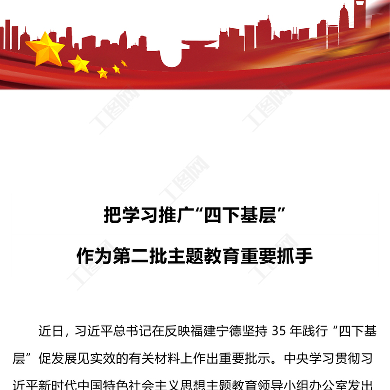 工圖網提供弘揚四下基層優良作風PPT把學習推廣四下基層作為第二批主題教育重要抓手黨課下載(講稿)供會員免費下載。更多精彩黨課PPT素材,盡在工圖網。