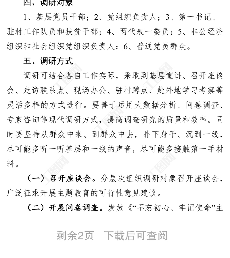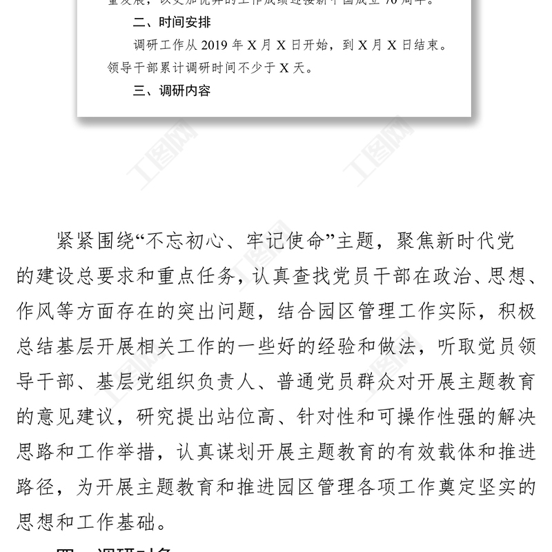 工圖網(wǎng)提供黨性鍛煉計(jì)劃“不忘初心牢記使命”主題教育調(diào)研活動(dòng)工作方案供會(huì)員免費(fèi)下載。更多精彩黨課PPT素材,盡在工圖網(wǎng)。