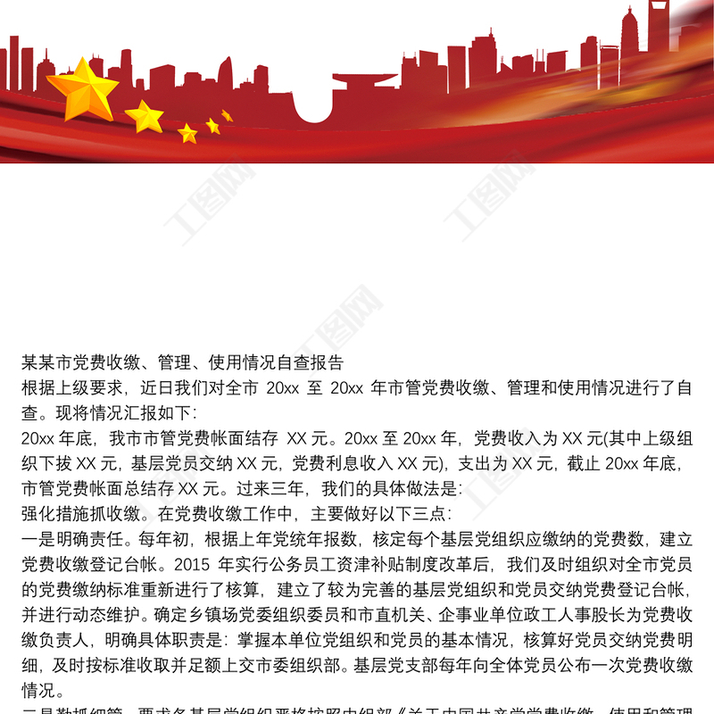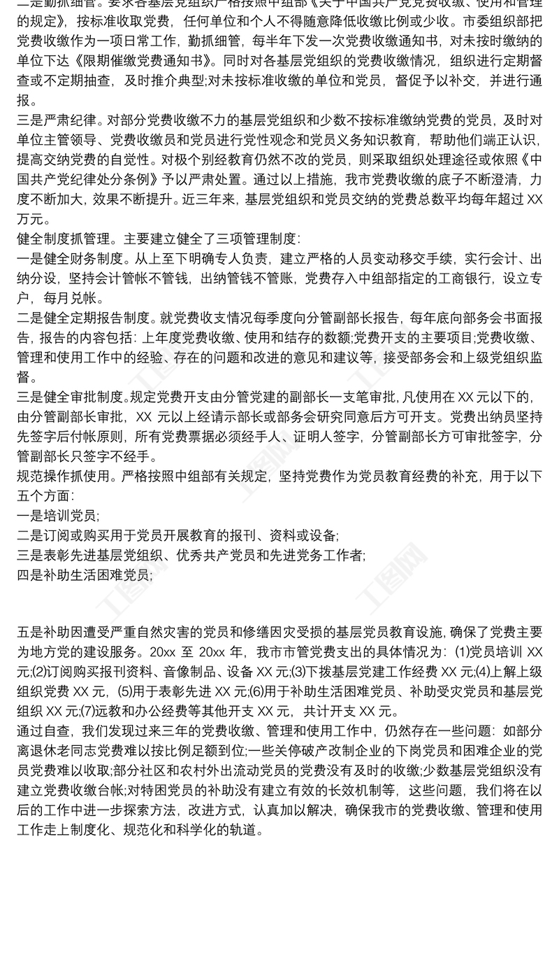 工圖網(wǎng)提供某某市黨費(fèi)收繳、管理、使用情況自查報(bào)告供會(huì)員免費(fèi)下載。更多精彩黨課PPT素材,盡在工圖網(wǎng)。