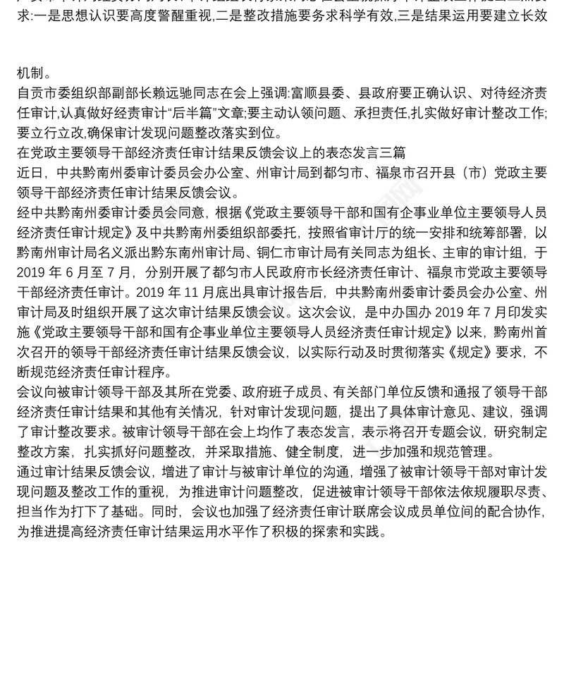 在黨政主要領(lǐng)導(dǎo)干部經(jīng)濟(jì)責(zé)任審計(jì)結(jié)果反饋會(huì)議上的表態(tài)發(fā)言三篇 Array