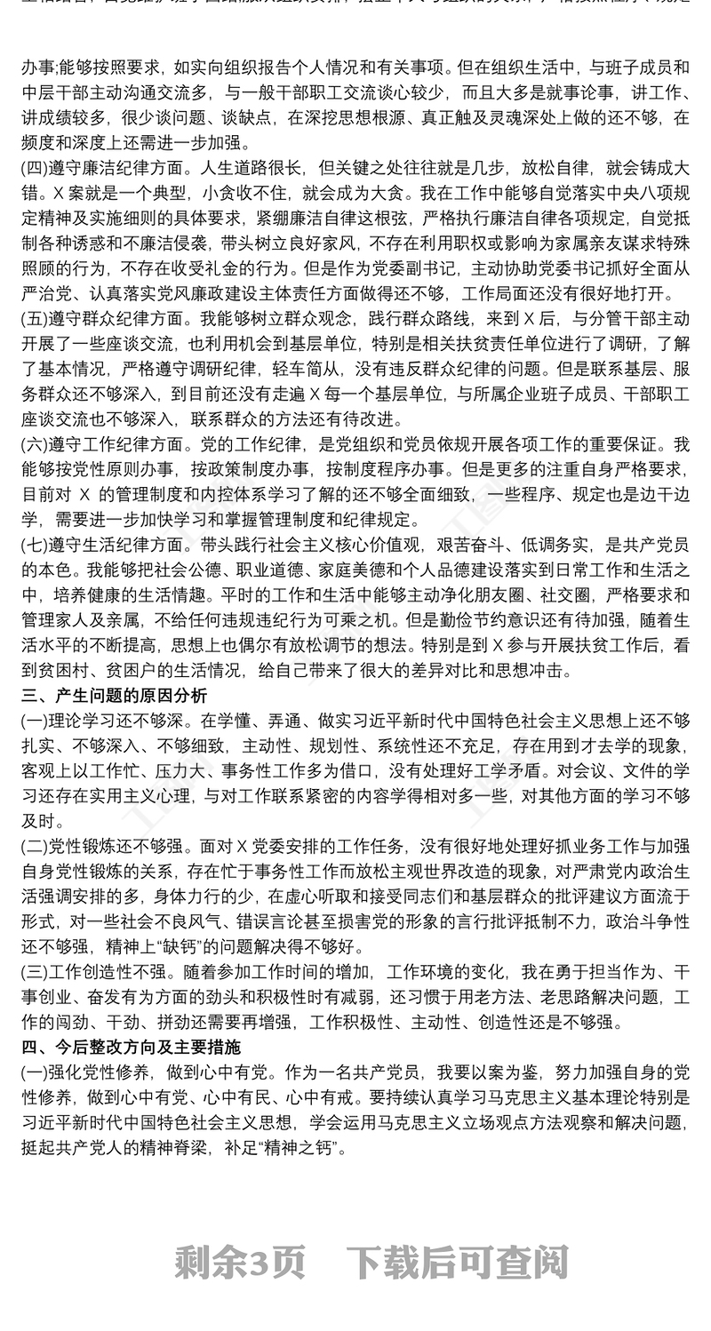 X嚴重違紀違法案以案促改專題民主生活會個人對照檢查發言包含