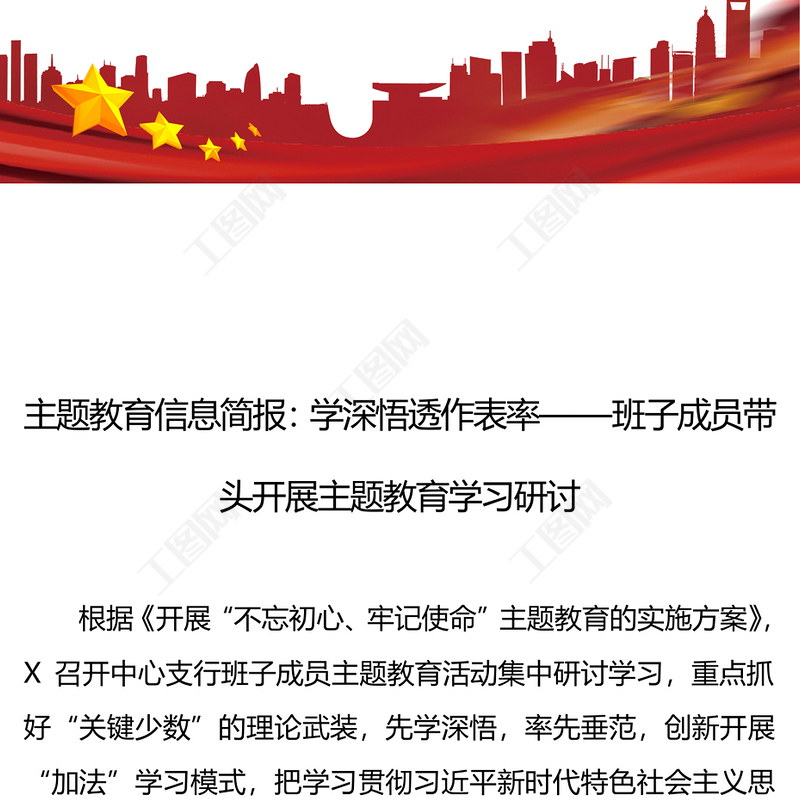 工圖網(wǎng)提供學(xué)深悟透作表率-班子成員帶頭開展主題教育學(xué)習(xí)研討不忘初心主題教育供會員免費下載。更多精彩黨課PPT素材,盡在工圖網(wǎng)。