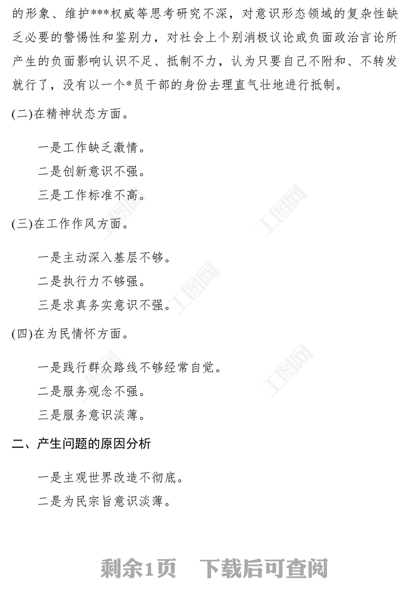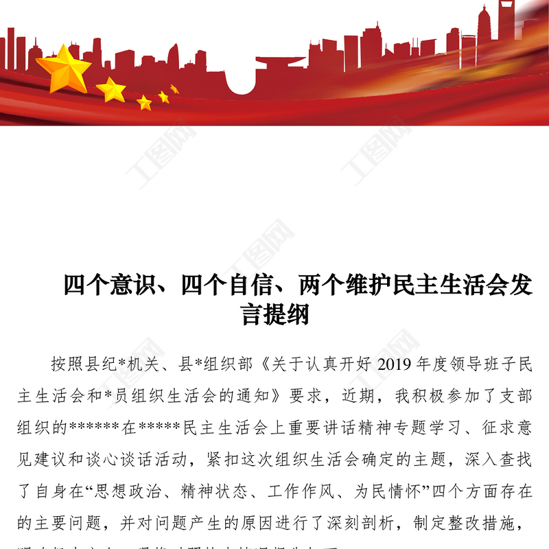 工圖網(wǎng)提供2021【領(lǐng)導(dǎo)講話】四個意識、四個自信、兩個維護民主生活會發(fā)言提綱供會員免費下載。更多精彩黨課PPT素材,盡在工圖網(wǎng)。