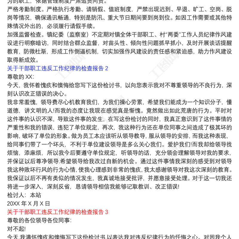 工圖網提供關于干部職工違反工作紀律的檢查報告3篇供會員免費下載。更多精彩黨課PPT素材,盡在工圖網。
