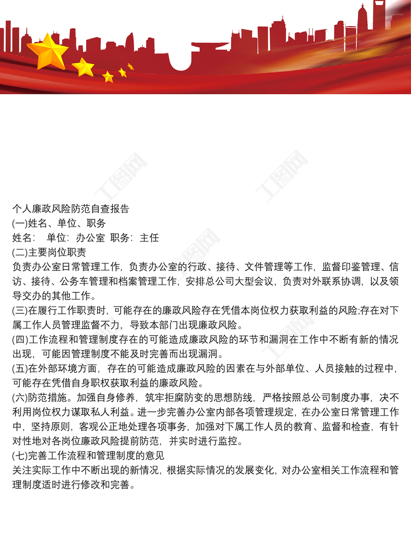 工圖網(wǎng)提供個(gè)人廉政風(fēng)險(xiǎn)防范自查報(bào)告供會(huì)員免費(fèi)下載。更多精彩黨課PPT素材,盡在工圖網(wǎng)。