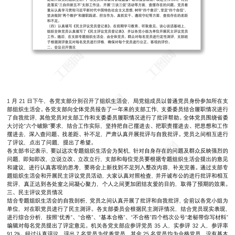 工圖網提供專題組織生活會和民主評議黨員情況的報告供會員免費下載。更多精彩黨課PPT素材,盡在工圖網。