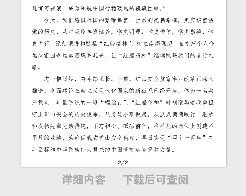 工圖網(wǎng)提供黨史學(xué)習(xí)心得重溫建黨歷史賡續(xù)紅船精神黨史學(xué)習(xí)教育心得體會(huì)研討發(fā)言材料參考范文礦山安全監(jiān)察系統(tǒng)工作人員供會(huì)員免費(fèi)下載。更多精彩黨課PPT素材,盡在工圖網(wǎng)。