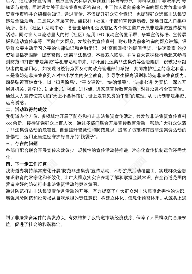 街道辦事處防范非法集資宣傳月活動工作總結范文 Array
