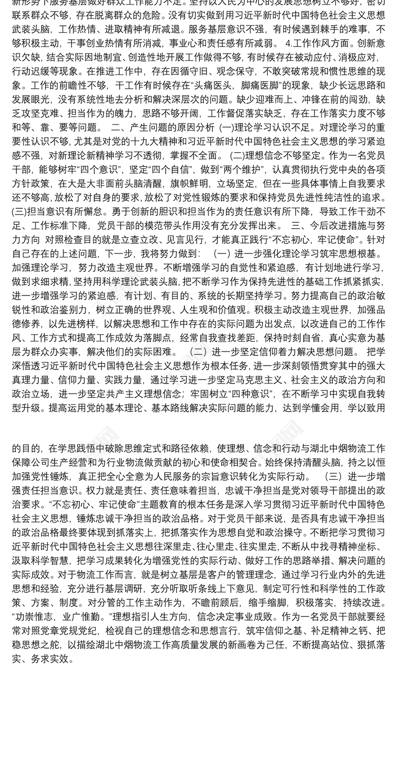 第二批“不忘初心、牢記使命”主題教育個人對照檢查材料