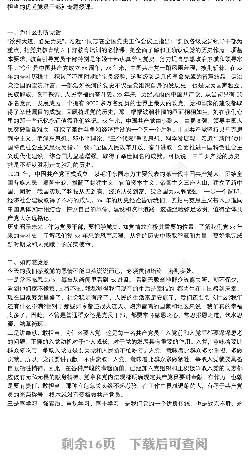 工圖網(wǎng)提供黨課講稿:聽(tīng)黨話 感黨恩 跟黨走 做忠誠(chéng)干凈擔(dān)當(dāng)?shù)膬?yōu)秀黨員干部(通用12篇)供會(huì)員免費(fèi)下載。更多精彩黨課PPT素材,盡在工圖網(wǎng)。
