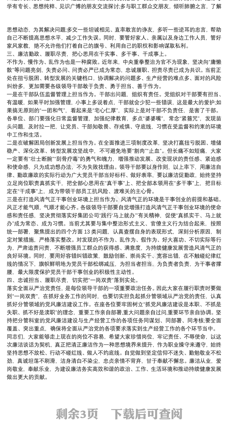 國企書記在黨員干部集體廉潔談話會上的講話包含