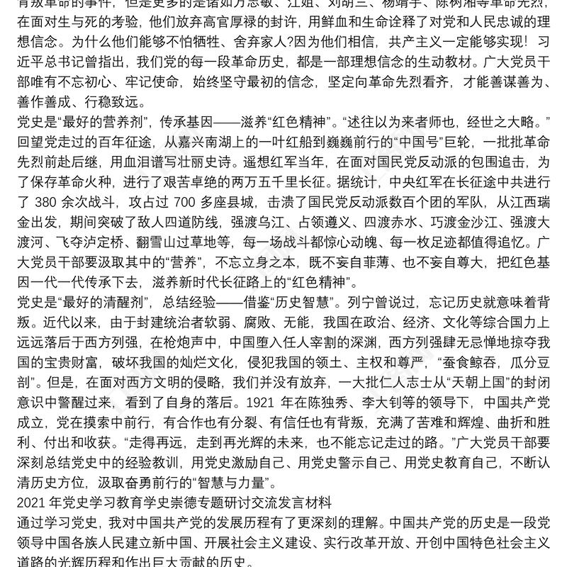 2021年黨史學習教育學史崇德專題研討交流發言材料