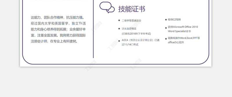 工圖網提供紫色簡潔財務會計求職面試word簡歷模板下載供會員免費下載。更多精彩黨課PPT素材,盡在工圖網。