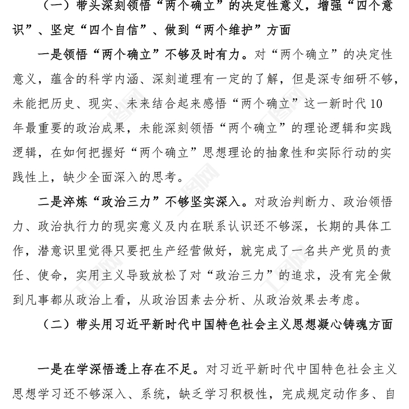 2023年民主生活會六個帶頭個人對照檢查2022年度六個方面兩個確立思想凝心鑄魂全面領導改革發展穩定斗爭精神從嚴治黨責任等方面集團企業黨委書記檢視剖析材料發言提綱