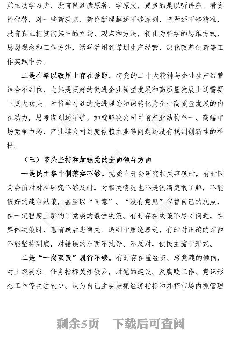 > 對照檢查 > 2023年民主生活會六個帶頭個人對照檢查2022年度六個方面兩個確立思想凝心鑄魂全面領導改革發展穩定斗爭精神從嚴治黨責任等方面集團企業黨委書記檢視剖析材料發言提綱.DOCX 【圖片、文字、動畫均可編輯】