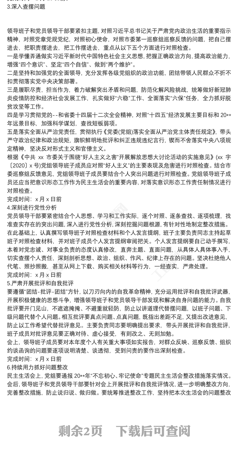 2022巡察整改專題民主生活會領導班子對照檢查材料2022年巡察整改專題民主生活會對照檢查材料剖析模板2022巡察整改專題民主生活會個人材料2021一案一整改專題民主生活會對照檢查材料2021市委巡察整改專題民主生活會方案2022市委巡察整改專題民主生活會實施方案2022巡察整改專題民主生活會要談心談話記錄2022縣教育局局長巡察整改專題民主生活會檢視剖析材料2022涉糧巡查反饋問題整改專題民主生活會個人發言2022巡察整改專題民主生活會黨委書記對照檢查材料2022黨史學習教育暨以案促改專題民主生活會情況報告2022巡察整改專題民主生活會會前談心談話提綱2022巡察整改專題民主生活會黨組書記個人對照檢查材料