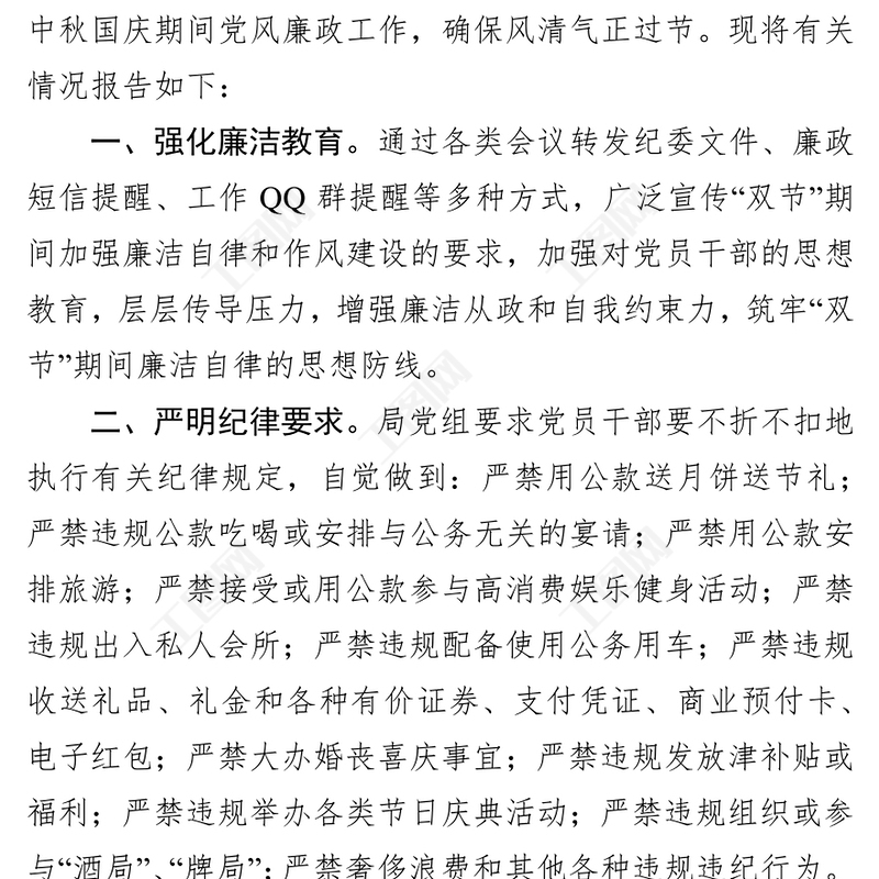 關(guān)于“中秋”“國(guó)慶”期間黨風(fēng)廉政建設(shè)的情況報(bào)告