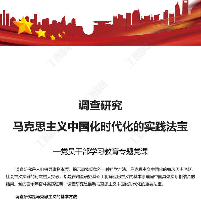 工圖網提供馬克思主義中國化時代化的實踐法寶是調查研究PPT大氣精美風黨員干部學習教育專題黨課課件模板(講稿)供會員免費下載。更多精彩黨課PPT素材,盡在工圖網。