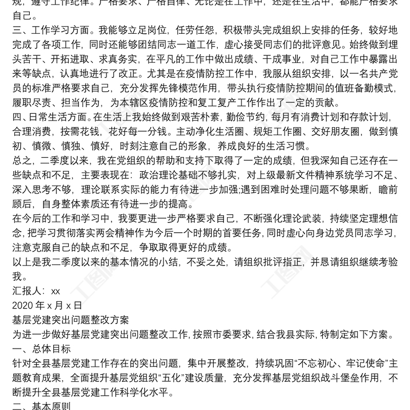 > 計(jì)劃方案 > 2020年第二季度思想?yún)R報(bào)例文及基層黨建突出問(wèn)題整改方案合輯.DOCX 【圖片、文字、動(dòng)畫(huà)均可編輯】
