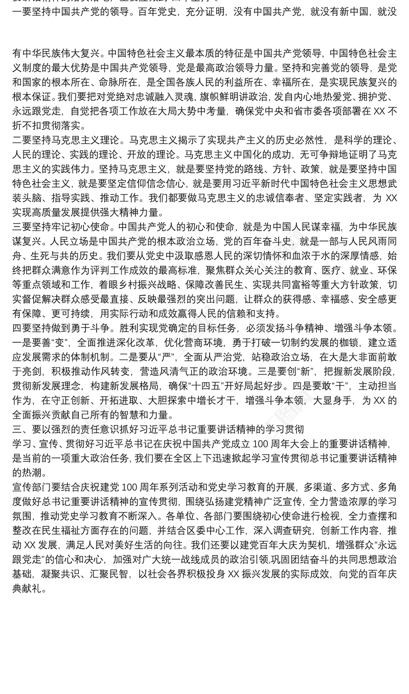 在區級領導班子黨史學習教育專題讀書班暨區委理論學習中心組(擴大)專題學習會上的主持講話提綱