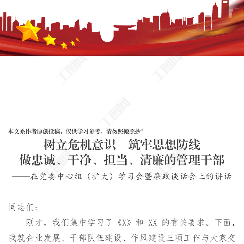 工圖網(wǎng)提供樹立危機意識筑牢思想防線做忠誠干凈擔當清廉的管理干部供會員免費下載。更多精彩黨課PPT素材,盡在工圖網(wǎng)。
