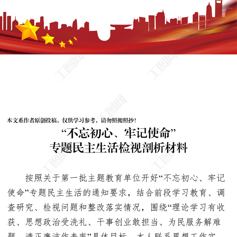 工圖網提供不忘初心牢記使命專題民主生活檢視反思材料供會員免費下載。更多精彩黨課PPT素材,盡在工圖網。
