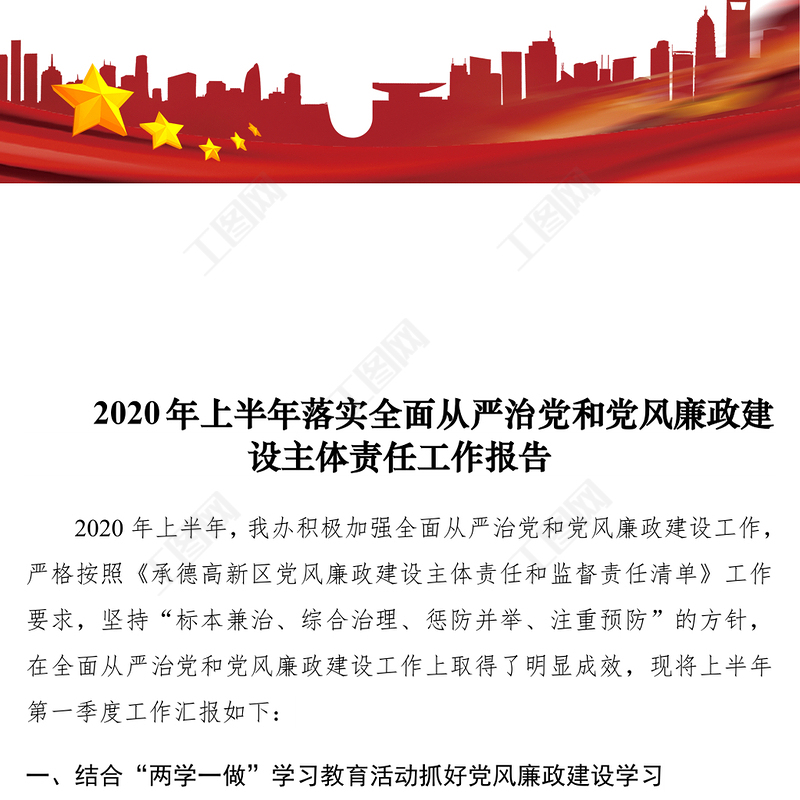 工圖網提供2020年上半年落實全面從嚴治黨和黨風廉政建設主體責任工作報告供會員免費下載。更多精彩黨課PPT素材,盡在工圖網。