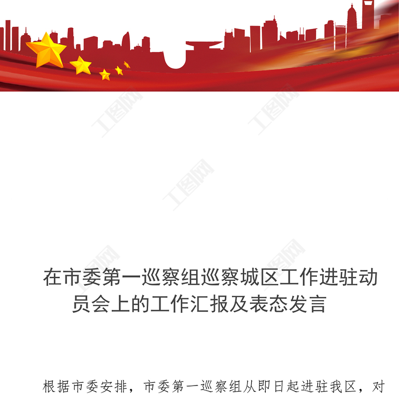 工圖網提供在市委第一巡察組巡察城區工作進駐動員會上的工作匯報及表態發言供會員免費下載。更多精彩黨課PPT素材,盡在工圖網。