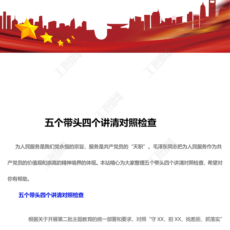 工圖網提供五個帶頭四個講清對照檢查供會員免費下載。更多精彩黨課PPT素材,盡在工圖網。