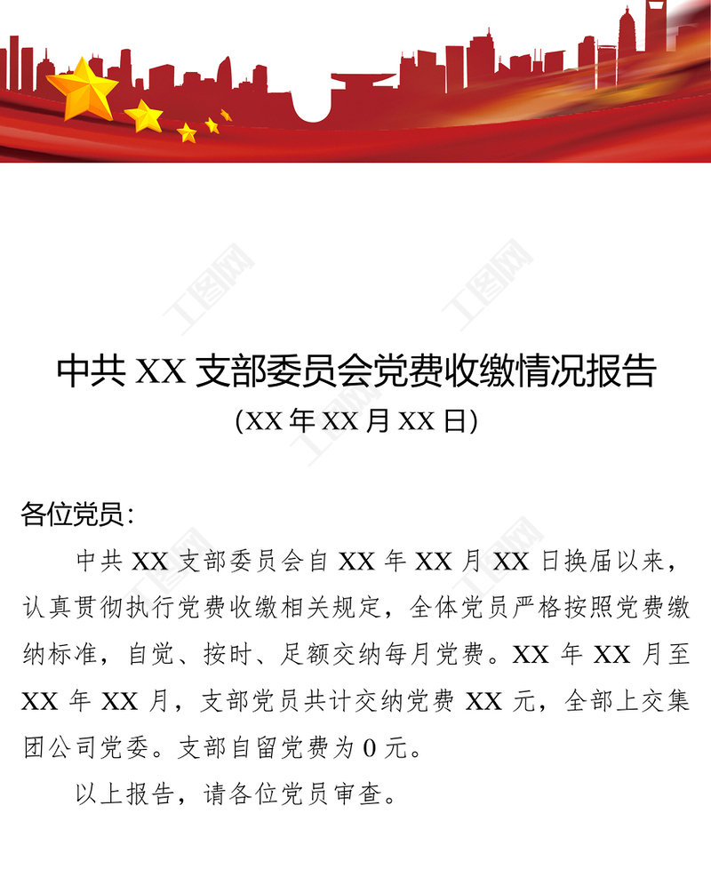 工圖網提供中共XX支部委員會黨費收繳情況報告供會員免費下載。更多精彩黨課PPT素材,盡在工圖網。